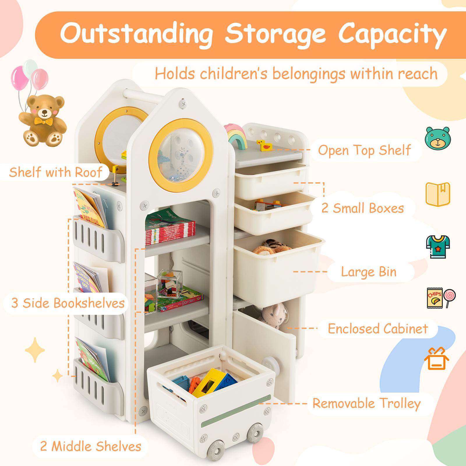 COSTWAY Kids Toy Storage Organizer, Multipurpose Toy Chest and Bookshelf w\u002F Mobile Trolley, Enclosed Cabinets & Storage Bins, Side Bookshelves, Storage Cabinet w\u002F Unique Roof