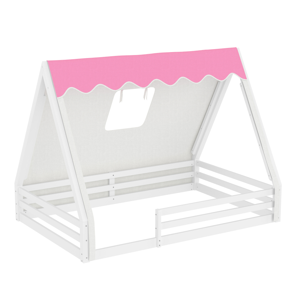 Full Size House Floor Bed with Tent And Light, Solid Wood Teepee Floor Bed with Full-Length Guardrails, Childlike Design, White+Pink