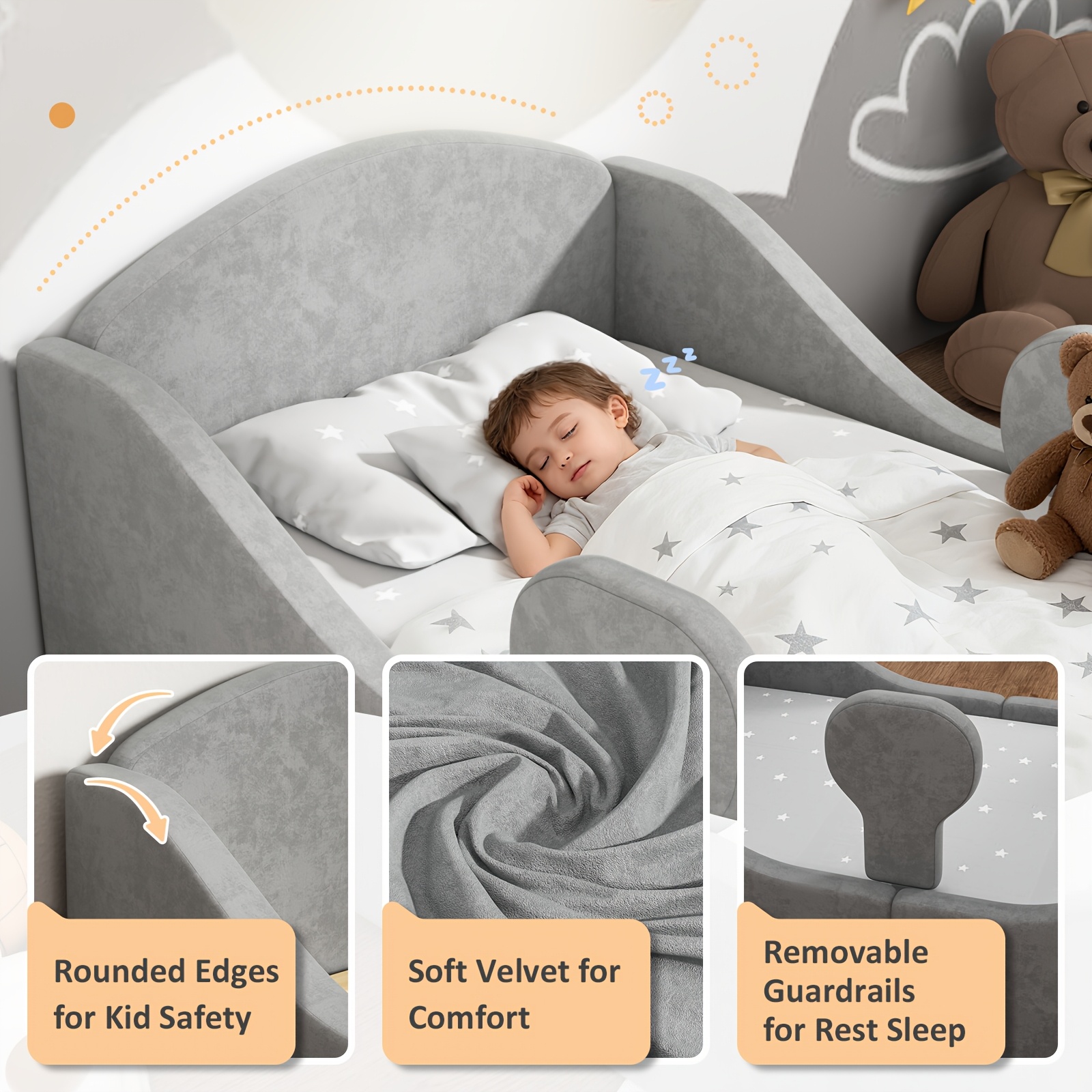Toddler Bed, Certified Toddler Floor Bed With Removable Safety Rails | Standard Crib Size Ultra Soft Upholstered Kids Bed For Girl Boy Pink, Blue, Gray - Wood, Pine Finish, Assembly Required, Mattress Not Included